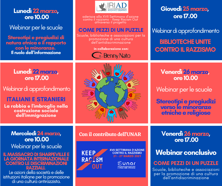 Come ogni anno, in occasione della ricorrenza della Giornata mondiale per l’eliminazione delle discriminazioni razziali che si celebra il 21 marzo, l’UNAR promuove la “Settimana di azione contro il razzismo”, campagna di sensibilizzazione, informazione e approfondimento finalizzata alla prevenzione e al contrasto di ogni forma di discriminazione e intolleranza, che si terrà dal 21 al 27 marzo 2021.