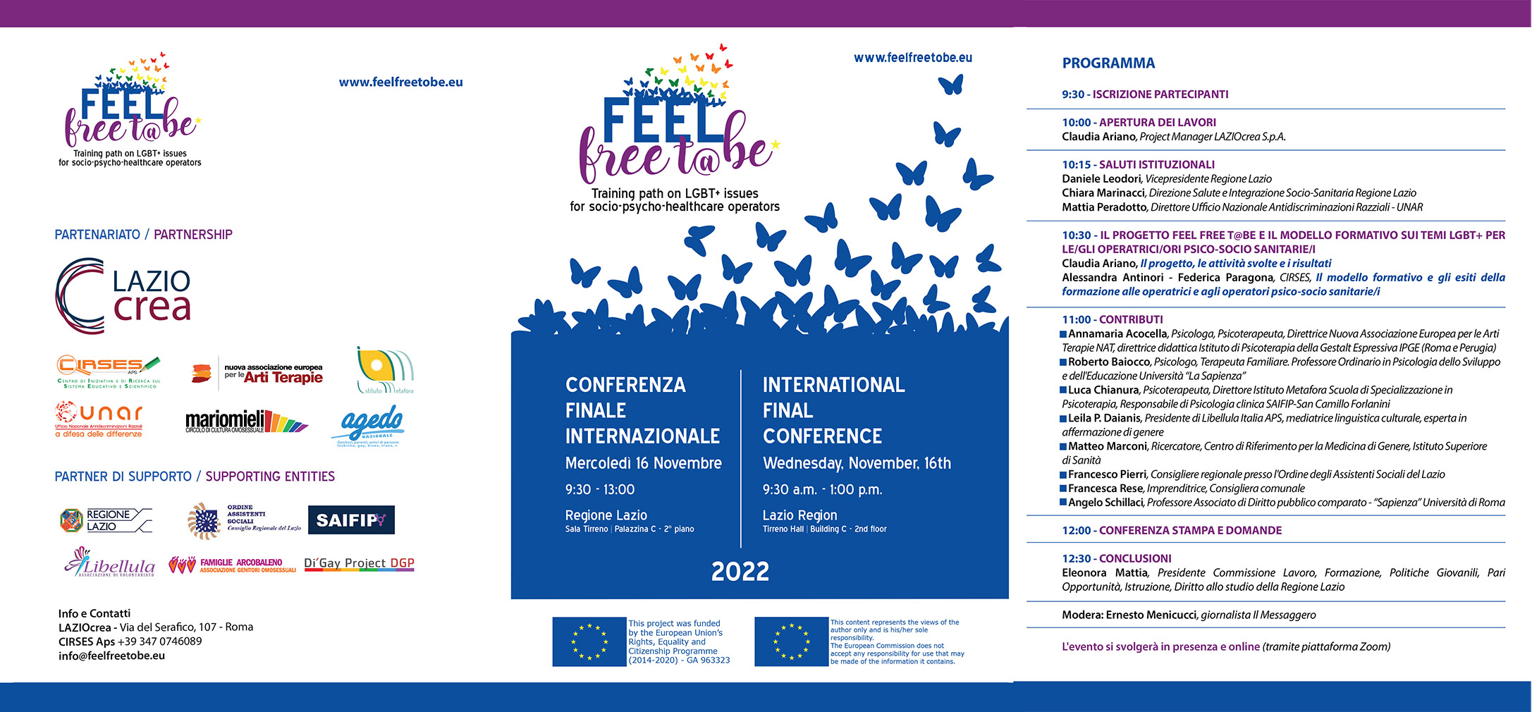 la conferenza finale di presentazione dei risultati del progetto FEEL FREE T@ BE finalizzato a promuovere l’uguaglianza di genere e a prevenire comportamenti e atteggiamenti discriminatori nei confronti delle persone LGBT+ nei servizi socio-sanitari pubblici.